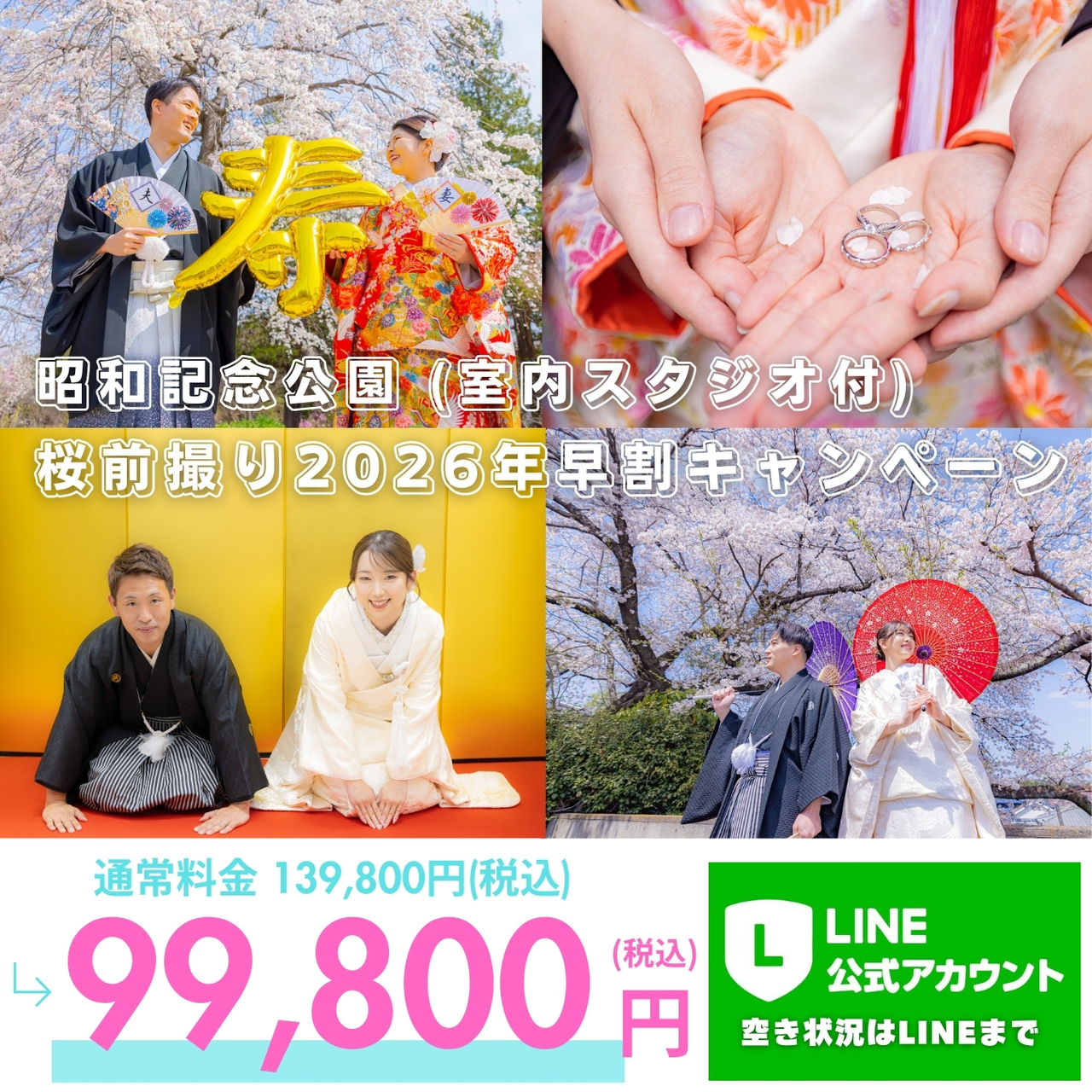 | 昭和記念公園 ロケーション&スタジオ 撮影場所 / 東京都立川市 昭和記念公園 支度場所 / CRYSTAL WEDDING 青梅店 撮影後 現地にてお着替えし撮影後すぐにご帰宅可 | 99,800円(税込) ※土日祝祭日は別途+10,000円(税込) |