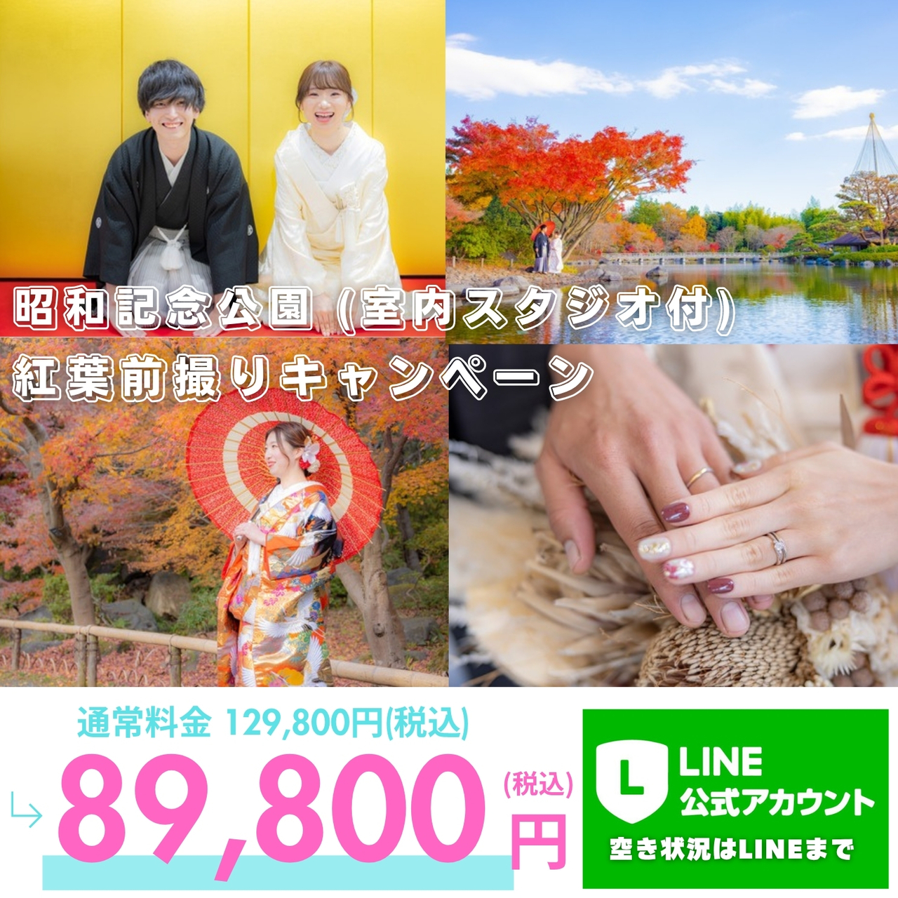 | 昭和記念公園 ロケーション&スタジオ 撮影場所 / 東京都立川市 昭和記念公園 支度場所 / CRYSTAL WEDDING 青梅店 撮影後 現地にてお着替えし撮影後すぐにご帰宅可 | 89,800円(税込) ※土日祝祭日は別途+10,000円(税込) |